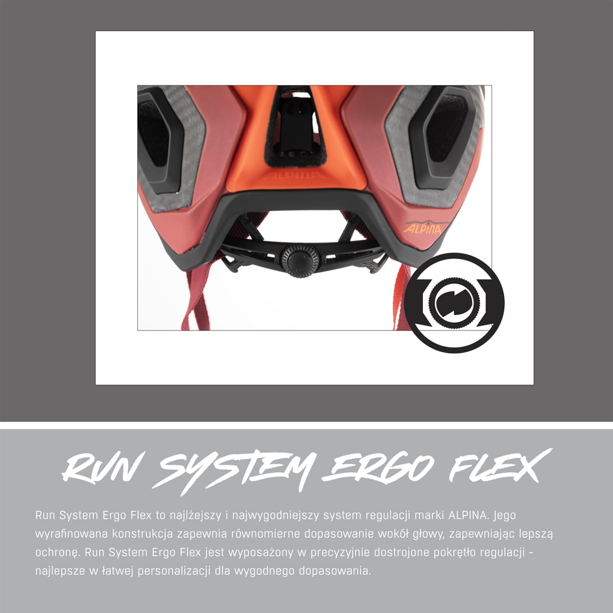 Każdy, kto ma na głowie Alpina Rootage, ma najlepszą możliwą ochronę na szlaku. Maksymalne bezpieczeństwo, optymalne dopasowanie i najlepsza możliwa klimatyzacja wnętrza, to główne cechy kasku. Aby zapewnić maksymalne bezpieczeństwo, w Alpina Rootage zastosowano karbon. Płytki z włókna węglowego są wbudowane w zewnętrzną powłokę kasku, dzięki czemu jest on bardziej odporny. Krawędzie kasku są wykończone Edge Protect, dodatkową ceramiczną powłoką, zapewniającą ochronę krawędziom kasku. Wkładki z poliwęglanu wzmacniają duże otwory wentylacyjne, które wraz z wewnętrznymi kanałami zapewniają głowie możliwie najlepszy dopływ chłodnego powietrza. Dzięki Alpina Rootage możesz nie tylko pokonywać wyboje, ale także radzić sobie z podjazdami. Pomimo niezwykle twardej skorupy zewnętrznej kask ma super miękki rdzeń. Antybakteryjna, nadająca się do prania wyściółka jest wykonana z materiału COOLMAX™ i wygodnie przylega do głowy. Run System Ergo Flex zapewnia optymalne dopasowanie. System regulacji zachwyca filigranową konstrukcją i równomiernie mocuje kask w 360 stopniach wokół głowy. Nie ma bardziej indywidualnego, łatwiejszego i wygodniejszego sposobu dopasowania kasku. To zdecydowana przewaga na trudnych trasach. Alpina Rootage można również łączyć z goglami. Umożliwiają to zintegrowany hak z tyłu i regulowana osłona z przodu. Flow, natura, adrenalina: tego szukasz na szlaku. Z Alpina Rootage na pewno znajdziesz to, czego szukasz.