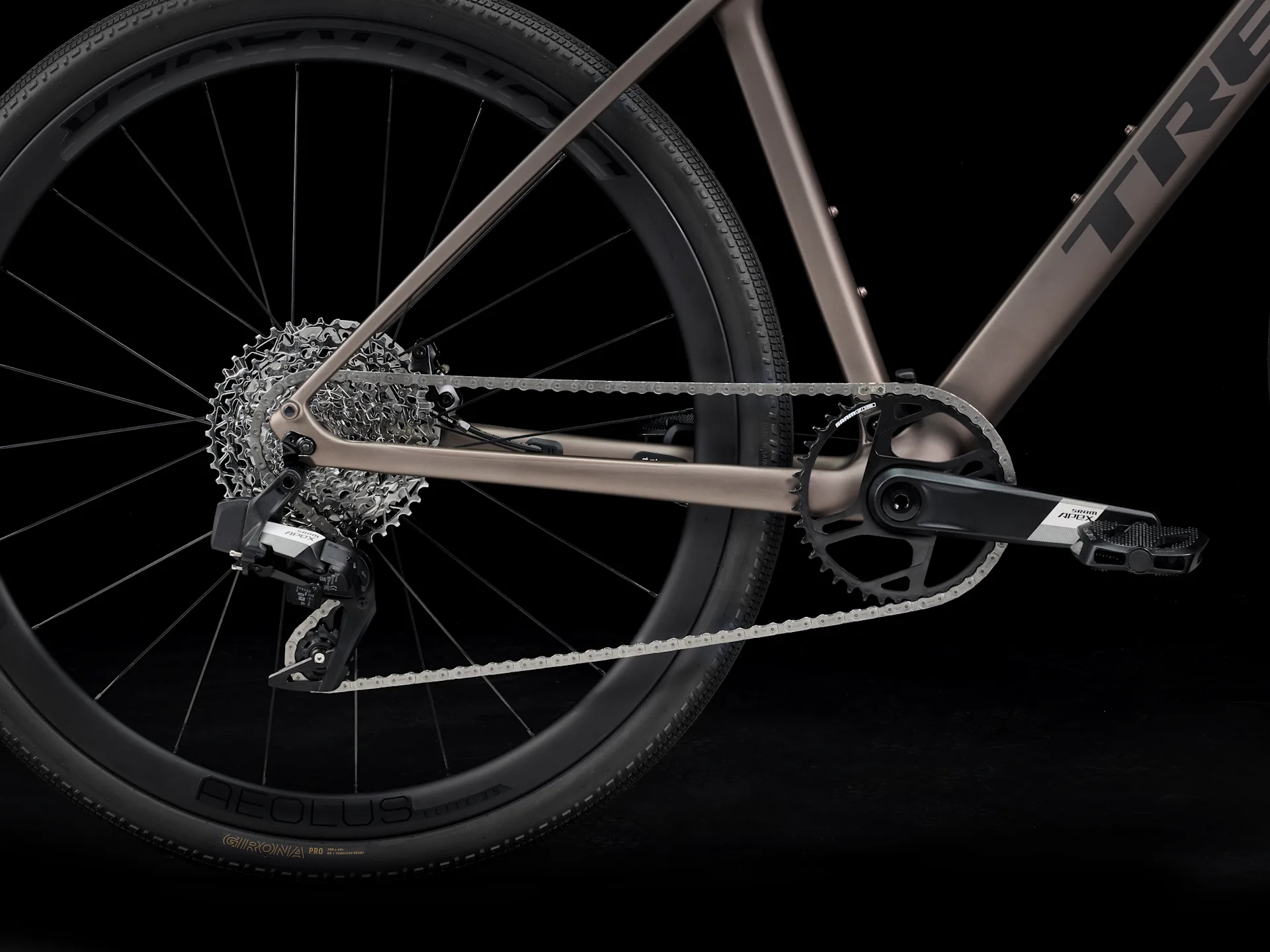Lekka rama z włókna węglowego OCLV Serii 400 oraz widelec z włókna węglowego, bezprzewodowy elektroniczny napęd 12-biegowy SRAM Apex XPLR AXS o szerokim zakresie przełożeń, hydrauliczne hamulce tarczowe, ukryte mocowania błotników, lekkie koła z włókna węglowego Bontrager Aeolus Elite 35 z wysokiej klasy oponami na szuter Bontrager GR1 Team Issue przystosowanymi do montażu bezdętkowego oraz pochłaniająca wibracje kierownica z ergonomicznymi chwytami.